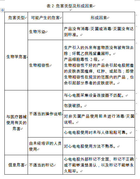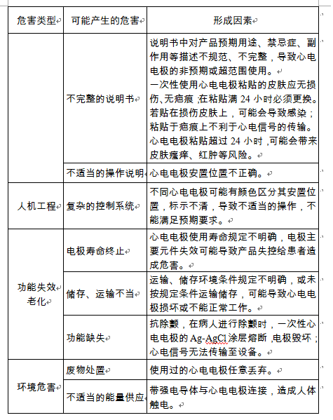 根據(jù)YY/T 0316—2016《醫(yī)療器械 風(fēng)險(xiǎn)管理對(duì)醫(yī)療器械的應(yīng)用》附錄E對(duì)“一次性使用心電電極”已知或可預(yù)見(jiàn)的風(fēng)險(xiǎn)進(jìn)行判定,產(chǎn)品在進(jìn)行風(fēng)險(xiǎn)分析時(shí)至少應(yīng)包括以下的主要危害,企業(yè)還應(yīng)根據(jù)自身產(chǎn)品特點(diǎn)確定其他危害。針對(duì)產(chǎn)品的各項(xiàng)風(fēng)險(xiǎn),企業(yè)應(yīng)采取應(yīng)對(duì)措施,確保風(fēng)險(xiǎn)降到可接受的程度。
