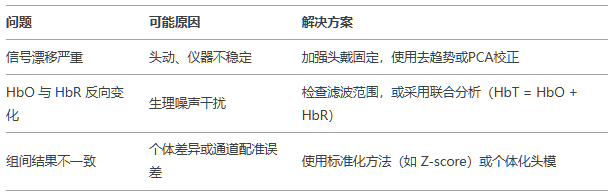 對 HbO/HbR 信號進(jìn)行 Z-score 或百分比變化(%Δ)標(biāo)準(zhǔn)化,減少個體差異影響。
