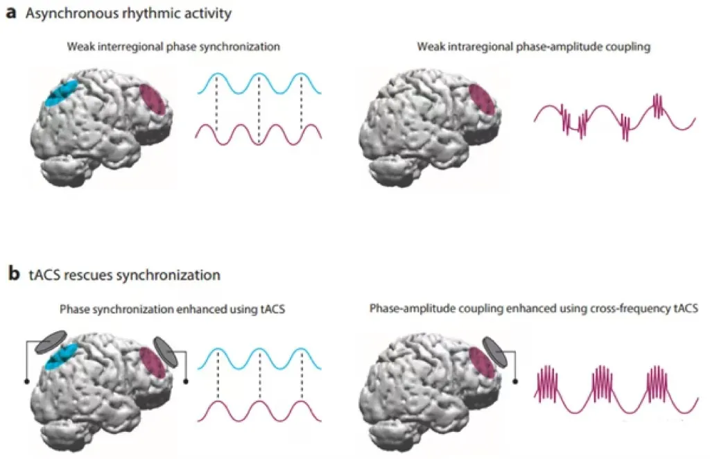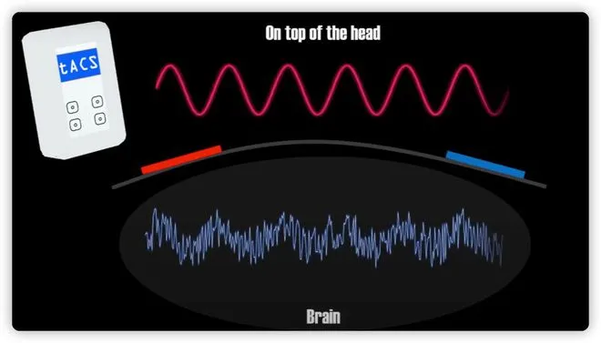 經(jīng)顱交流電刺激 (tACS) 是一種廣泛使用的無創(chuàng)腦刺激方法。tACS通過放置于頭皮的電極,將特定頻率的正弦波形交流電作用于目標(biāo)腦區(qū),通過夾帶大腦振蕩和誘導(dǎo)長期突觸可塑性來調(diào)節(jié)大腦功能,進(jìn)而調(diào)節(jié)認(rèn)知過程。